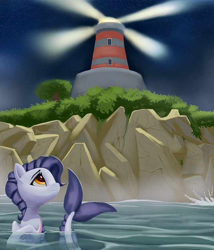 The Bright Tower was active that evening. Its light swept back and forth as it surveyed the bay. One pass refracted the water near the seaweed bed, where a starving Sea Pony tore a trembling mouthful of aquatic grass. From temple to tailtip, a clot of scaleless shredded skin disfigured the entire left side of her body.