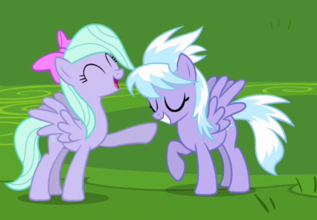 His tongue reached out and brushed in between her folds, just above her throbbing nub. Flitter shuddered, her own sucking turning more aggressive. Cloudchaser screamed as Flitter hit her clit.