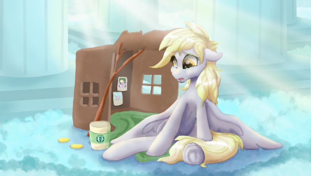 While she lay on the alley ground, her meandering eyes floated up towards the sky before blurring with tears. There was the sun now, cresting over the tall shops of downtown Cloudsdale to bring some measure of warmth to the hidden lanes spread amongst the city. A fluffy cloud drifted by, and Derpy sobbed.