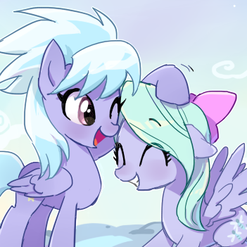 When Flitter's world had stopped spinning, she was looking up at her twin's smiling, flushed face. Her usually carefully-mussed mane was now genuinely untidy, her white and blue locks heavy with sweat and marked here and there with leaves. Before the younger mare could even begin to catch her breath, the older moved, slamming her lap once, twice down against Flitter's with a pair of damp claps, causing the gasping bottom mare to whimper and arch her back. All the same, she held out, and Cloudchaser leaned down to kiss her as a reward for her stamina.