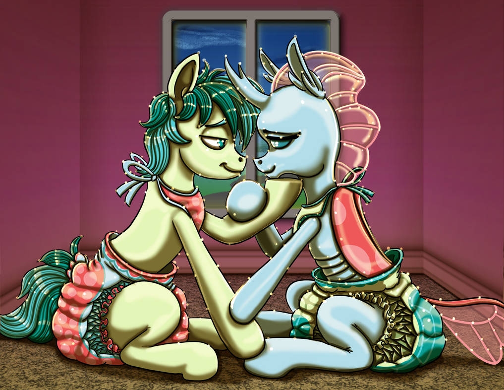 Curiosities and CrushesView OnlineRecovery and Role PlayCuriosities and CrushesSmolder sipped at her glass of black raspberry lemonade as she sat at one of the outdoor dining areas in Ponyville's market square. From her table, she had a good view of the Silly Filly foal supply store on this mild Saturday early afternoon. She just had to work up those dragon nerves to step inside, and so far, her lemonade wasn't helping. Counselor Trixie's Kink's and Fetishes class two summers ago had done wonders to help her get in touch with her inner 'cute and adorable' side, though the guidance counselor had to admit that it was one of those kinks that currently escaped classification with a word, likely due to the vast variety of what ponies could consider cute and adorable, but otherwise encouraged her to explore as much as she wanted. In some circles, it was referred to as 'tomboy taming'. For the young adult dragoness, 'cute' was all about frou frou-y, lacey, frilly, glittering dresses. It wasn't exactly a secret among her close friends, due to having to attend a tea party dressed in one to face her fears under the school. She wasn't afraid of being cute, but she was still struggling with admitting she liked being cute. And even if her friends knew, she wasn't exactly prepared to walk out of Carousel Boutique with a garment bag yet. Now, having periodically seen Sandbar and Ocellus in their ageplay attire, her mind was ready to file one more thing into her 'Cute' folder. Diapers and frilly infantile dresses. So with Ponyville experiencing a little bit of a population dip due to Spring Break, she figured her best chance of getting in and out of Silly Filly with a few samples without being spotted, would be right now. So here she sat, keeping a close but inconspicuous eye on the ponies entering and exiting the store, trying to judge when would be the best time to step inside. But for now, it was time for a refill on that lemonade. Sandbar sat on the floor of his bedroom, biting his lip as he carefully lowered the wooden alphabet block between his two front hooves onto the stack of eleven in between his rear legs. The bottom of the block barely touched the top one before Sandbar slowly brought his hooves away, and the stack was now twelve tall, and the padded pony wondered if he'd beat his current record of thirteen before Ocellus came into check him and find his rather soggy diaper in need of changing. The changeling had opted to wait just long enough to be sure that all of what Sandbar had deposited up in her just before lunch had seeped out of her, then got out her diaper, finding it just a bit damp, and cleaned up with a quick shower, and slid more into a 'motherly' role for the day. The infantile stallion suckled on his turtle shell pacifier and grabbed another block. But his record would stand as he set it on top of the stack a little too quickly, and the whole tower wobbled for a moment before it came tumbling down in between and on both sides of his rear legs. He clapped his front hooves together playfully, determined to try again. But he didn't even get two blocks high before he felt the back of his diaper being tugged back, but strangely didn't feel a hoof along with it. Almost as if his diaper was being checked by... Magic. "Well, I do believe my loyal subject needs a change." A regal, commanding voice said behind him. Sandbar's ears twitched at the somewhat familiar voice, and turned to see the Princess of the Night and Dreams, Luna, standing behind him, her magic releasing the back of his diaper. "And no maids nearby to complete this task. I do suppose I can be bothered to get you cleaned up, my little colt." Sandbar wasn't sure where Ocellus found the time to practice changing into one of the rulers of Equestria, but it was a nearly perfect transformation. It would seem she was serious when she said if he didn't bring up any fantasies for her to fulfill, that she'd take matters into her own hooves, and he remembered telling Ocellus about Luna's royal duties of patrolling the dream realm, keeping a watchful eye for things that would need her personal intervention, such as ethereal threats, or recurring nightmares. A bit further down the conversation, he had told her while he had no idea if she ever actually did so herself, that he occasionally had intense sexual dreams where she would investigate, and get involved herself. The stallion had to admit; so far, in her first few sentences, Ocellus had a reasonable handle on her characteristics. Instead of magically lifting him up to the changing table, the royal facsimile magically pushed the alphabet blocks to the side, and laid out a towel, lifting Sandbar up momentarily to get it under him. With that done, she magically reached over to the shelves of the changing table and bringing over a bottle of foal powder, a container of wipes, a doubler insert, and a clean diaper. With all of that set beside them, she turned her attention to the one Sandbar was currently wearing, and magically tugged at the tapes. One by one, they were torn loose, and his wet diaper was peeled off of his belly and nethers, and flopped down to the towel between his legs. A moment later, a trio of wipes were levitated out of the package, and one by one, were used to give his diaper area a quick once over. He shivered as the cold wipes touched his groin, but his semi-erect stallionhood stood higher due to the attention. "Well well, it seems my subject is enjoying his princess seeing him like this. I do suppose I should deal with that, I don't believe a clean diaper would fit around that." Sandbar wasn't sure what to expect next, but as Ocellus-Luna magically grabbed and unfolded a clean diaper, briefly lifting his backside up to slide it under him, she also took a few steps forward so she was standing over him, giving him a better idea of their size difference. Luna was smaller than her older sister, but she was still considerably larger than fully grown mares. The Prin