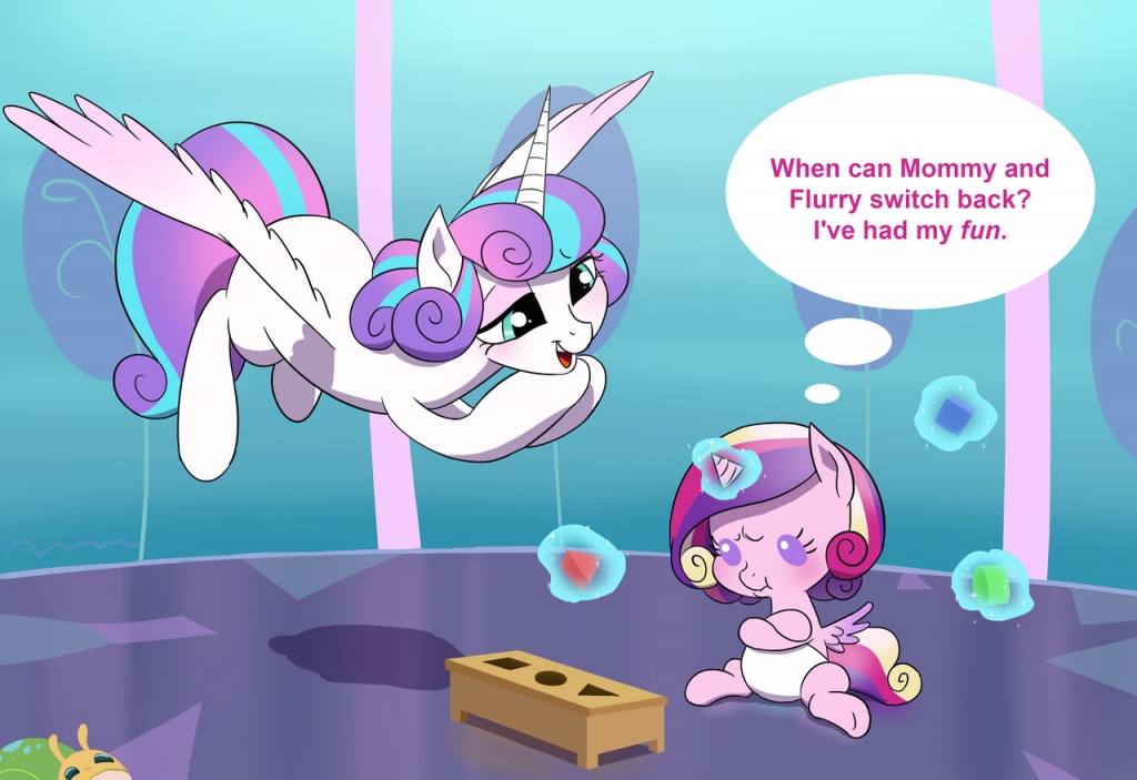 Discord gives the baby Flurry Heart a nice present which of course has its own magical twist to it. Cadance is about to find out what being a foal is like. Rather fun really.