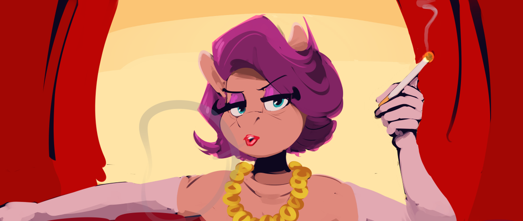 Once she looked within, she could scarcely make out a curved figure on a large couch. Squinting her eyes, Diamond's vision adjusted until she saw something that almost burned into her mind. It was Spoiled Rich, her mother, reclining on the large couch. Swirling around her was a somewhat thick plume of smoke that flowed from her long cigarette holder. But it was not the sight of her mother that seemed to scar her thoughts, but the fact she could clearly see her mother naked. Her breasts, a little sagging, yet seemed so massive compared to Diamond's developing bosom. She was not alone however, as the filly could clearly see a pair of large, strong, red arms reaching out from behind her mother.