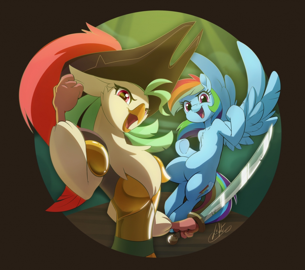 Rainbow and Cap'n Celeano hit it off pretty well at one point, and they've been pen pals for years now. Captain Celaeno finally decided to pay a visit to Ponyville, and Rainbow is happy to hang out and show her around. And also offer romantic advice.