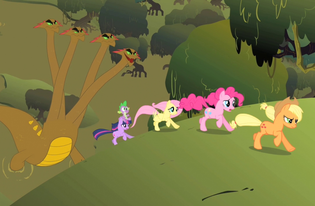 But even worse than being trolled left, right, and up by the Pinkie Sense, a pony-eating hydra chased Twilight and her friends through a swamp, Froggy Bottom Bog, and to a chasm. Said friends, Pinkie, Fluttershy, Applejack, and Spike, were safe on the chasm’s other side.