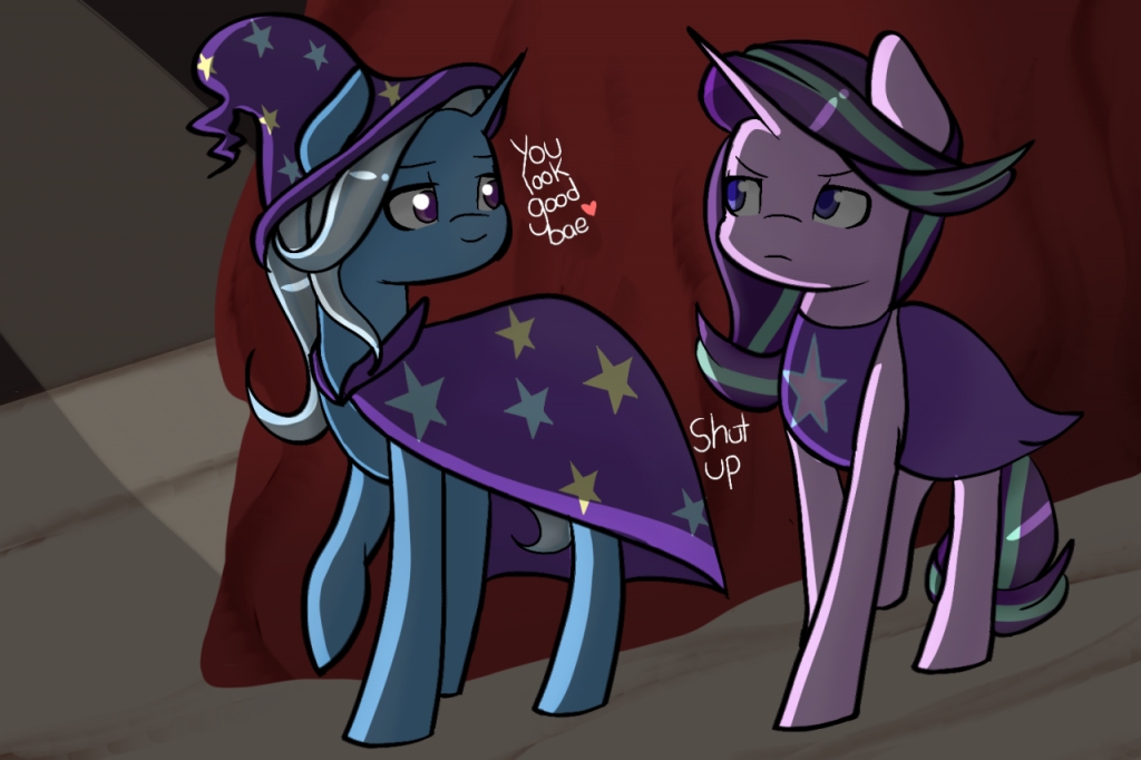 The casualness of the statement threw Starlight off for a second, but then she realized what was said and nearly shrieked, “W-wait, Canterlot’s next?!” A nonchalant ‘mm-hm’ from her marefriend confirmed it, making her sputter out, “U-um, c-can’t we have s-some baby steps?! I-I’m not used to large audiences staring at me, you know!”