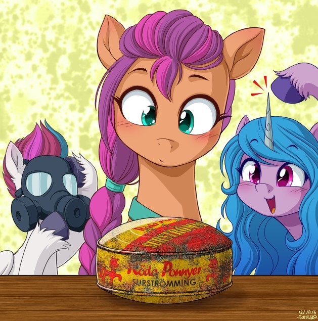 “Hey Pipp squeaks! I’m coming to you live today with a very special viral video including my best friends, the ponies who returned magic to Equestria! They’re going to try Surströmming for the very first time!”