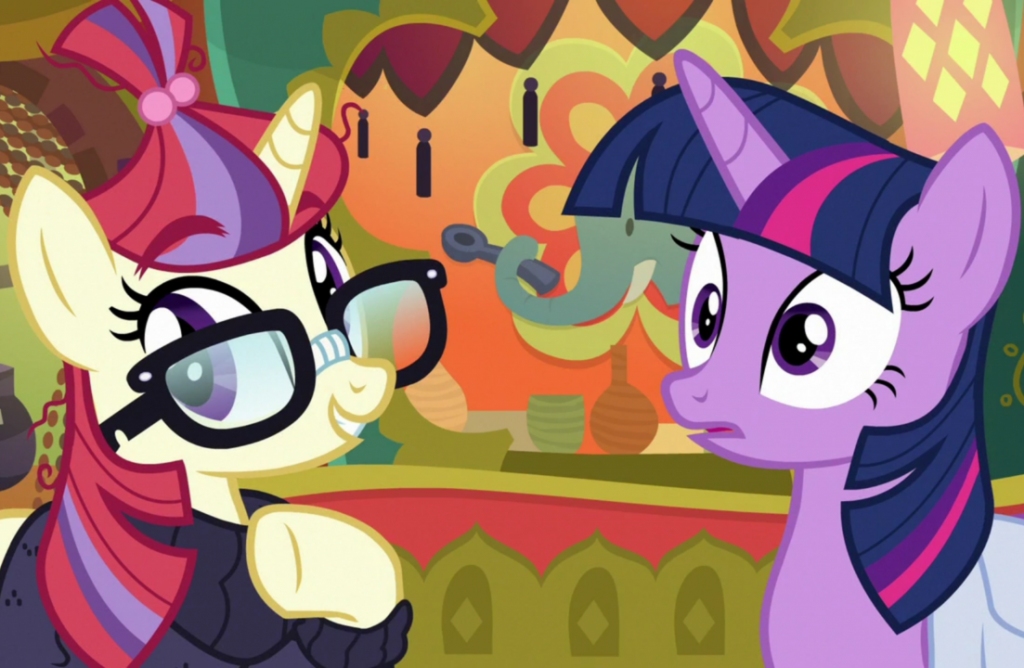 "Tell me if you see any librarian-type ponies," Twilight said as they entered the Tasty Treat.