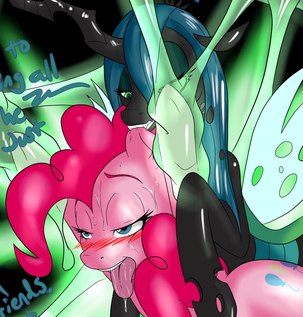 The Queen’s scepter kept drawing her attention as it grew harder, seemingly loving the sheer domination its owner spoke of, but Pinkie forced her gaze off of it and looked back up to Chrysalis’s face with what she hoped was a look of irate valor, but was more than likely a lust-drunk look that almost pleaded for sex, she tried to say firmly, “W-we aren’t going to g-give into our new s-stupid sexy bug overlords t-that easily!”
