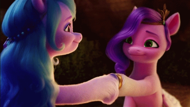 Below, Izzy rolled out a big banner that read, “Izzy + Pipp 5Ever!!!” and she sang, “Well, I’ve never met a pony who makes me feel like you do.” She stopped, perked up, and said, “Is it weird that we’re rhyming ‘do’ with ‘do?’”