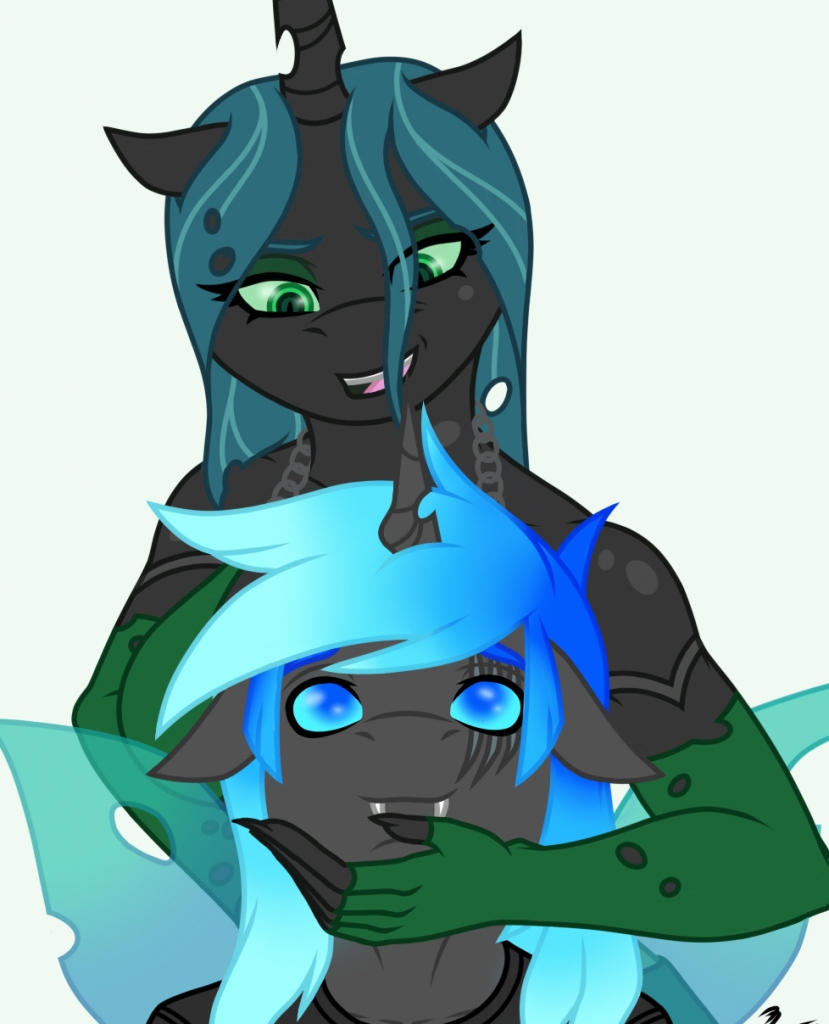 She fell silent, turning and finding herself staring squarely at the Matriarch’s considerable bosom. Without making a sound, faster than should have been possible, Chrysalis had crossed the chamber to loom over her. Swallowing hard, she turned her head to look away - unfortunately, a slender hand grabbed her jaw and turned her muzzle upward.