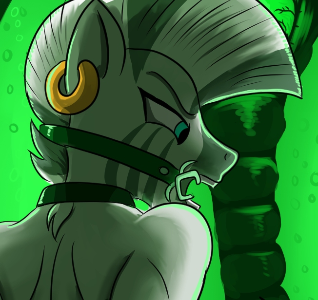 Zecora was soon distracted from her thoughts by the sound of approaching hoofsteps, and perked up as a changeling spoke “Ah, there you are.” The blindfold and muzzle soon withdrew back into the wall, allowing to see who spoke after her eyes adjusted to the dim light. In front of her was a changeling wearing a collar denoting high status within the hive, accompanied by a well-kept earth pony mare holding a container, presumably a personal servant. Interestingly, the mare had a reserved but confident demeanor, rather than the meek submissiveness of most slaves, and even wore some bits of golden jewelry on her otherwise nude body.