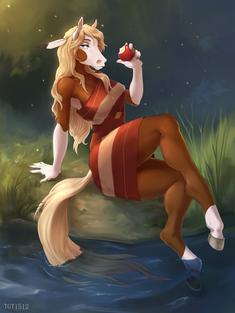 The couple continued their walk through the acres until they walked past the small creek near the edge of the tree line. Just then, the two ponies heard what sounded like light splashing. At first, they just brushed it off as running water but then heard someone’s voice. Mac and Sugar looked at each other with curiosity and went to investigate the strange noises. The two came up behind a large bush, and Mac pushed it down slightly. The married couple expected to see a random passerby, which was pretty common, and they didn’t mind it. However, what they saw was completely unexpected. Mac and Sugar froze in place when they saw their employee, Rain, in the middle of the water of the creek, stark naked for all to gaze at her gorgeous body. Her ass was the perfect shape in both size and voluptuousness. Both cheeks were perfectly round and were twice the size of buckball balls. Her tits were as large as the married couple had surmised; large and firm, both sporting healthy pink nipples that were erect due to the cold weather. Her mane and tail were a little damp and seemed to glisten in the moon’s light as she scooped up some water and rubbed her arms. Sugar swallowed a lump in her throat as Rain bent over and she caught a glimpse of Rain’s cameltoe pussy.