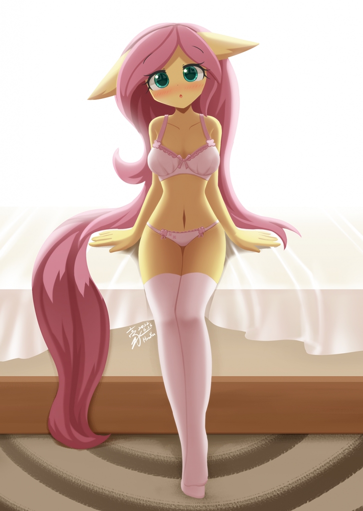 Adam arrived to the mare’s bedroom as he pushed open the door. Upon entering, the human gasped at the sight before him. On the bed, was his girlfriend, but her attire was different than what she wore during the party. Fluttershy was wearing some white and pink lingerie as Adam could make out her breasts and how big they were. Adam could feel his groin starting to press through his pants as the mare uncrossed her legs and sat on her knees to address her lover.