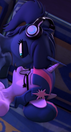 Princess Luna and Princess Twilight Sparkle were both naked, and making out on the couch. The lunar mare having a pair of headphones partially over her head, while the other had a pair of glasses to help with her eyes after playing games for too long. They two of them were taking a small break from it. But knowing Luna, it didn't take long for the two of them to start enjoying each other. They were moaning and rubbing themselves, with the lunar alicorn's eager and skilled fingers exploring the moist insides of Twilight's damp pussy.