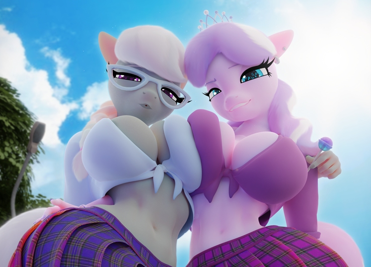 Further and further back, Rarity was shoved by their pair of tits, until she lost her balance, falling back. Landing on her ass, she looked up to see the mares staring down at her. The way they looked at her, and how they stood, standing so close to their sides that their tits pressed together a little. It was sending a shiver down Rarity’s spine as they were eyeing her up. She was realizing they were a lot more clever than she thought, and how she had been so easily lured away from anyone who could see or even hear them.