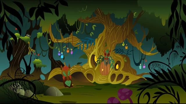 As the many steps of her journey concluded in her mind, Tempest found herself in a strange place within the Everfree. A massive tree, in which a straw, thatch, and wooden hut had been carved and shaped into the long, thick roots of this tree. Surrounding it were a number of masks Tempest believed were zebra in origin. But what was even more strange about this area, was how quiet it suddenly became. There were empty bottles hanging from branches, but while she could hear at least some unseen birds, the sound seemed to become silent as soon as she got close to the hut.