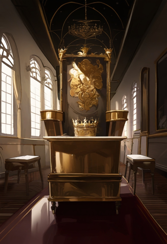 The sound of marching feet got all of their attention as Egyptian/space theme women soldiers came marching into the lunchroom and them parting to reveal a slender girl of medium height, with very dark grayish violet (and warm) hair that has horizontal golden streaks or highlights and olive tan skin. Her eyes are olive green as her overall color scheme is purple and gold. The defining trait that she is royalty is her golden crown in the shape of a tiara with an ibis in the center. She’s wearing an egyptian style dress gown which is a complex dress made with teal, cyan, golden yellow, white and semi-transparent sky blue materials. It is also shown coupled with bracelets, sandals and a necklace made out of gold, red gemstones, and some green-colored material.