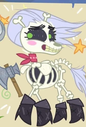 The Skeleton just shrugged in nonplusment, replying casually, “Oh well, I guess my own friends will have to do for the time being.” Grinning a bit, she pulled her hoof back from the other mare and grabbed her axe back from out of the ground, then tossed it around a bit while saying, “I can’t imagine that living Pony heads would go flying as far as a Skeleton’s. Wingdings’s certainly did, getting launched allll the way over—” She gestured widely, going from around her current position to far behind Sunset, likely over the hill and beyond the bridge, “—To the river over there. It floated along for a while, and took us a really long time to actually return to her. Turns out having your head in a completely different place makes flying really hard, so we had to hoof it.”
