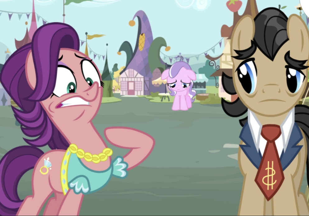 “B-Be that as it may, some of us have to make sacrifices amongst the upper echelons of society to get where we are. Do you really think I’d allow our Diamond to attend that horror of a public school here in Ponyville stuffed to the rafters with confused, insignificant, low-life blank-flanks and inept, coffee-swilling, lower-class teachers, if I had any other choice? I keep telling you: all it would take to improve our future prospects and those of our daughter by an infinitesimal amount would be to pack up our things tomorrow and relocate to Canterlot full-time. We have the resolve, we have the resources, and we have the status… so what’s stopping us?”