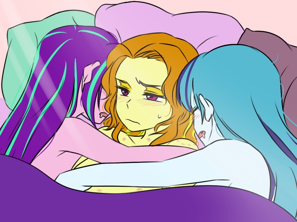 "Aw, it sounds like someone is cranky..." Sonata teased, still hugging her from behind. She reached down to tease Aria's pubic tuft. "I bet a good finger-blasting would turn that frown upside down."