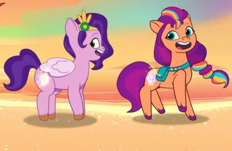 “Isn’t she so cute?” Pipp asked the camera, reaching a hoof out to pet Sunny’s head. Sunny happily responded to the petting by turning around and licking Pipp’s face.