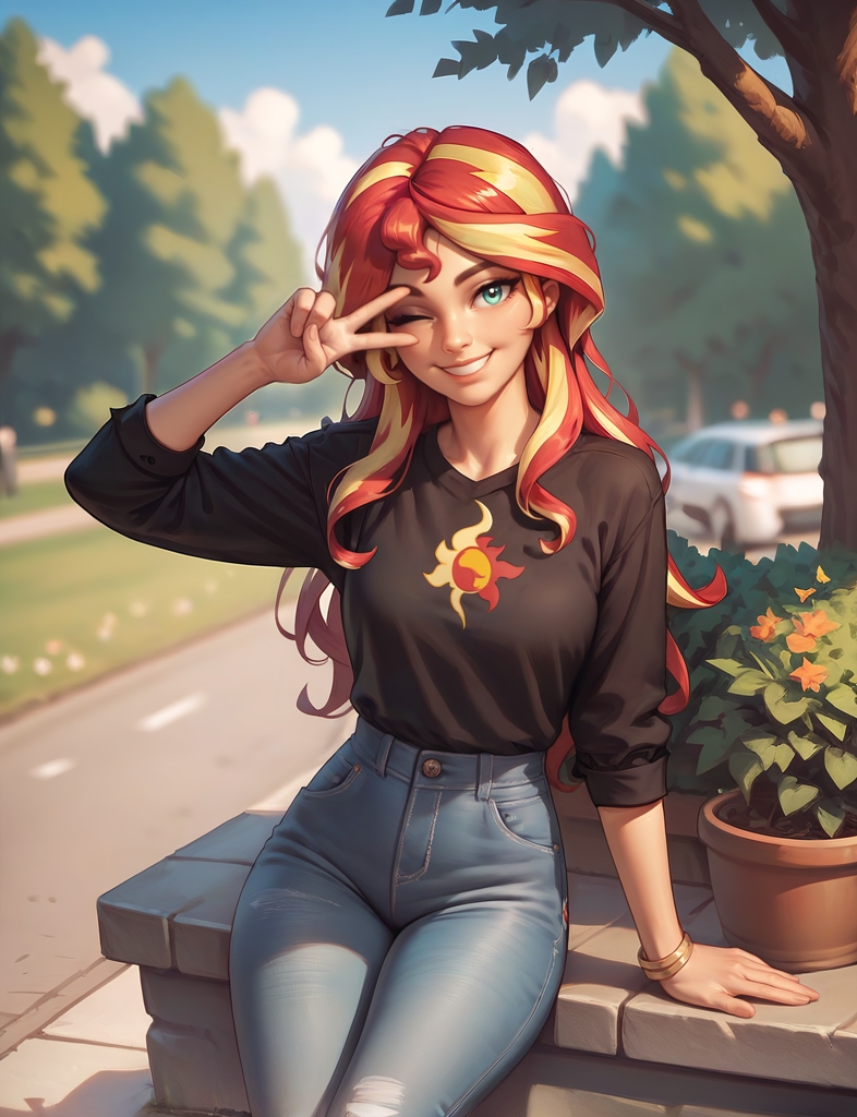 “Well, I’ll tell you one thing. Seeing you in that is making me very, very hard.” Sunset smirked, leaning against a nearby large rock. Running her hands over herself, she fondled one of her breasts, while the other rubbed along her growing bulge. “So how about we have a little fun before we go swimming.”