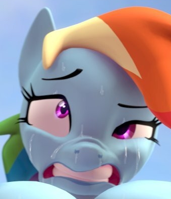That first pair of motions was only the start, and swiftly became a passionate rhythm of harsh pounding in and out of Rainbow Dash’s pussy—or rather, her entire body. How it must’ve felt to have her body punched through by a piston of meat and her pussy and womb stretched out and wrap around that piston, only for it to pull straight back out and leave her innards utterly empty but for the slick precum juices that came from her pussy and the pounding dick, begging for more and immediately filled far past the breaking point, yet not breaking... Well, she didn’t have any words for it; not externally, not with how gasps, moans, and even short chokes robbed her throat of anything that could come out, but she couldn’t even process it all mentally, with each shock of being overstuffed and then filled with a void and then being overstuffed again wearing on her already shaken brain, to the point her senses were getting muddled by the everything that was happening to her.