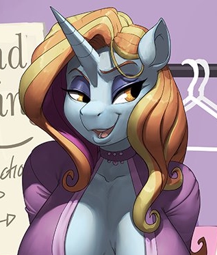 As soon as she had heard that Rarity had come up with a new line of special clothes, Suri just couldn’t resist. She knew this would be the chance to strike. Similar to Rarity, Suri liked to dress professionally. But unlike her rival, the older mare knew how to take full advantage of her features. She wore a white shirt, a loose fitting sweater and blazer that helped show off her impressive rack, which bounced a little as she walked. All with a knee-length skirt that gently swayed in the warm breeze. It was a change from her much more elaborate choice in attire, but the professional style attracted more customers while she was all but starting all over. Her sunglasses- covered eyes blazed with determination as she ran her plan through her mind. She would go to the store, and “borrow” a few design ideas. Then, she would produce them faster than Rarity could, and utterly defeat the mare who shamed her.