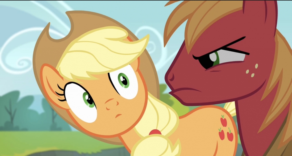 Now it was Applejack’s turn to feel distinctly uncomfortable, and her face turned a deep shade of crimson as she spun around to countenance her brother’s highly personal remarks.