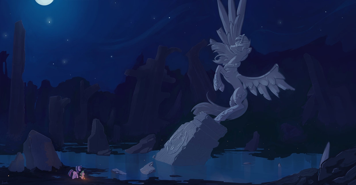 From above, he had always been able to tell that the supporting pillars which ringed the ground floor were not simple columns, but he had never been able to tell what, exactly, they were. Now, however, it was as clear as the hair on their heads. They were statues, the smallest reaching thirty feet high. All around him, alicorns from days long past stood in testament to their own power and glory, their frozen eyes filled with ancient authority. Phobos could almost feel himself shrinking in their presence.