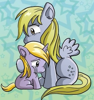 "Derpy! What's going, on what's wrong?!" Redheart yelled out. After seeing how I was she lowered her weapon and walked over to my bed. She sat by my side and wrapped her hooves around me in an embracing hug. Between my sobs I was able to make a sentence.