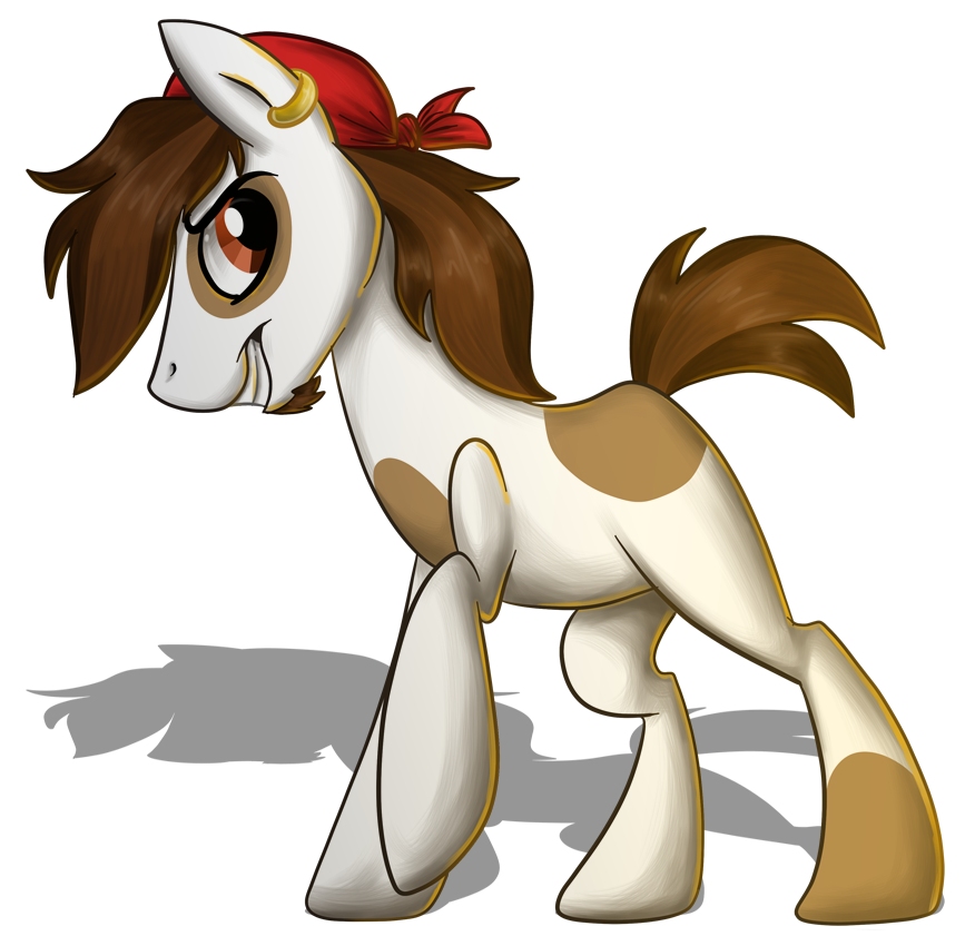 Quickly turning around, Scootaloo noticed her fellow classmate Pipsqueak dressed in his time old pirate suit which was made up of a simple red bandana, and a rather real looking sword strapped to his side, blocking her previous entry point. He was a young colt with a white coat and a few brown patches of fur on it giving him a unique appearance. In his short time in Ponyville, he actually grew a big larger than most colts his age. Before he could barely stand up to Scootaloo's height but now he was almost double her body size. His once short mane was now long enough to brush against his front legs and he had a small, yet noticeable brown goatee on his chin. While Scootaloo was normally happy to see her fellow classmates, Pipsqueak was the last colt she wanted to see.