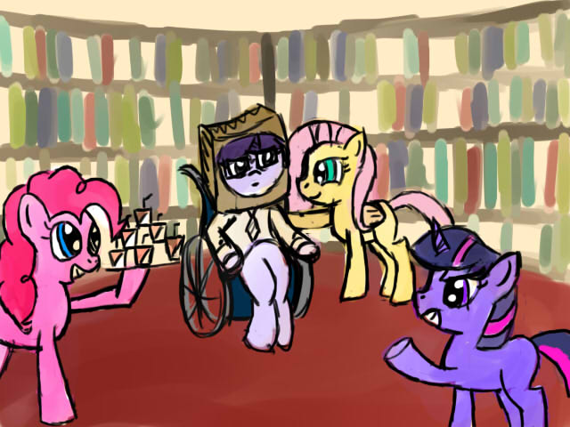 “That’s a ‘no’, I think,” Pinkie said. Several books sped through the air and smacked the wall around the ponies. They shifted over until their backs were at the window.