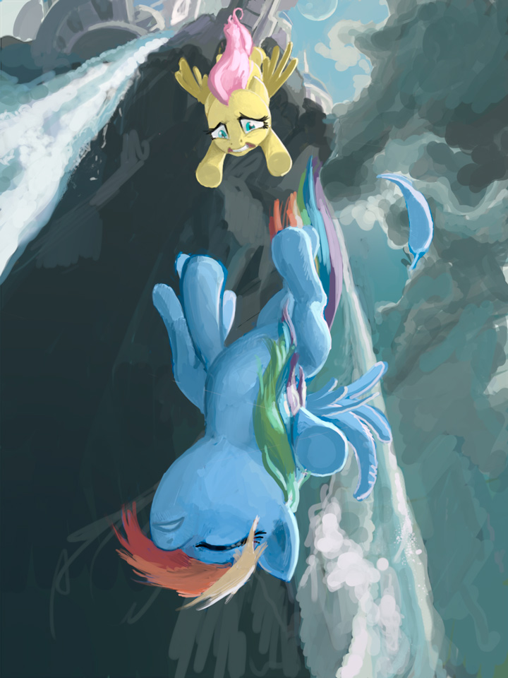 “Rainbow Dash!” she cried, rushing as close to the edge as she could bear. She leaned her neck out and caught sight of the blue deadweight rocketing towards the unforgiving ground below.