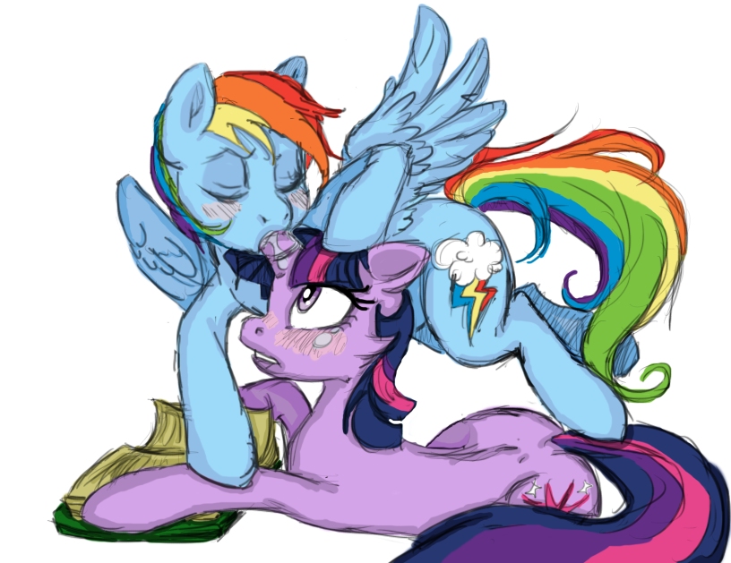 Before she could even get half a word out the violet mare found herself tackled and pinned to the floor. Rainbow Dash was instantly upon her with both of her hooves pressed down to her forelegs. Twilight gasped in surprise and was immediately suppressed with rainbow mashing her lips against her own, mouthing hungrily at Twilights tongue. Moaning softly she fought with the wild darting motion of that invasive tongue, clashing it with hers, pulling short breaths of air through their noses before Rainbow pulled away.3