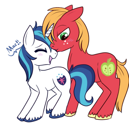 Shining leaned in slightly, closing the distance between the two ponies. “Your first stallion,” he said before reaching in and softly kissing Big Mac on the lips.