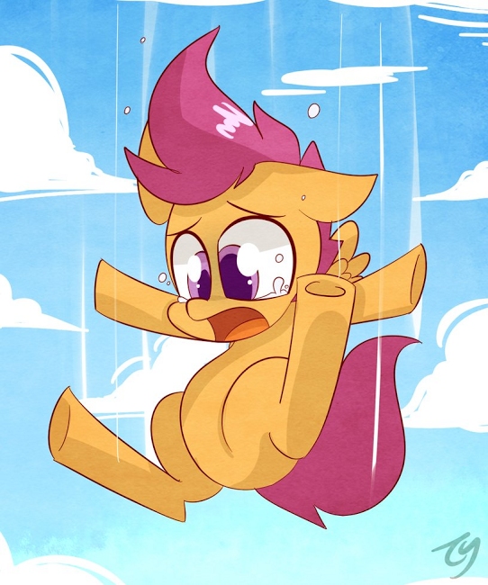 I can almost see the headlines of tomorrows paper in big, bold, black print read 'Ponyville's Own Scootaloo Makes History: First Pegasus To Plummet To Their Death. What a joke...